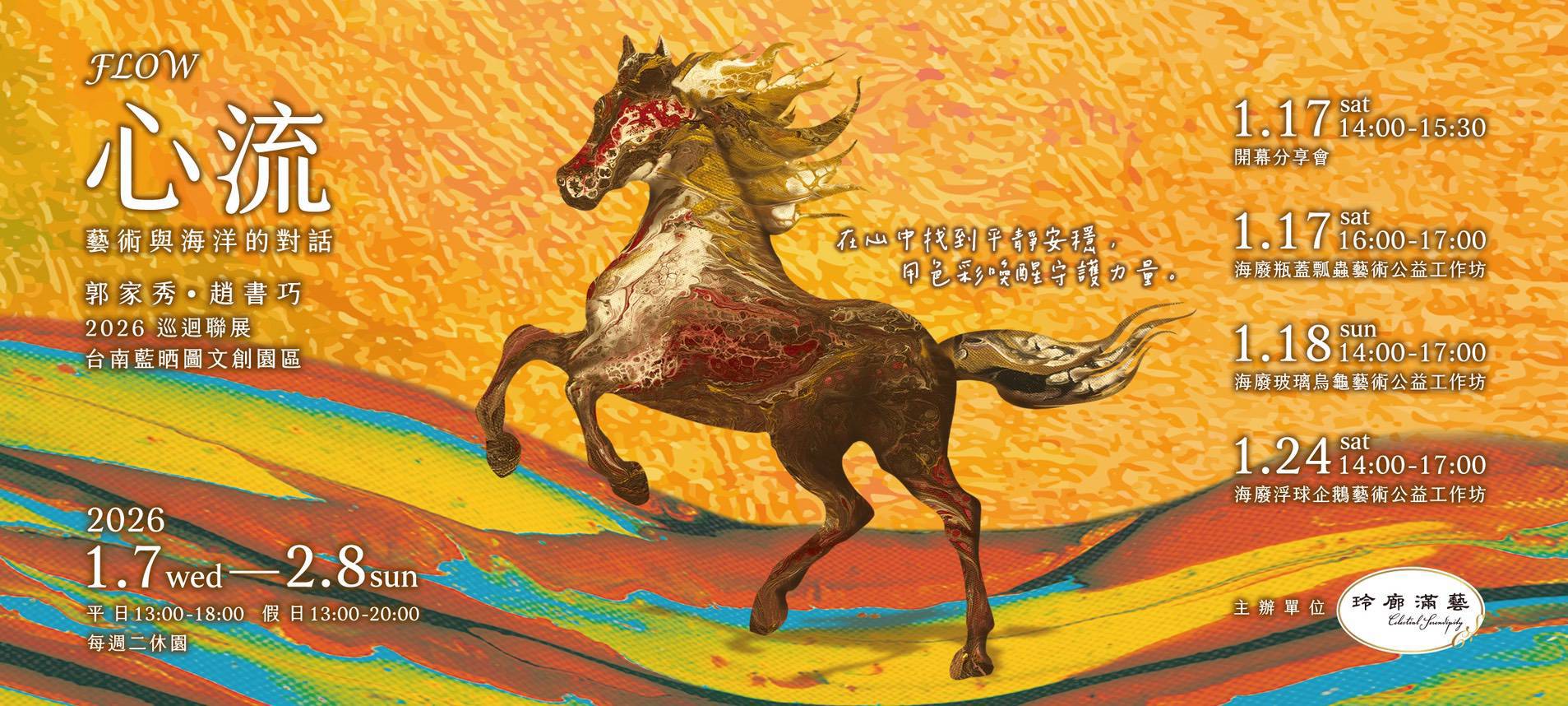 由統一集團旗下藝文品牌玲廊滿藝主辦《FLOW 心流—藝術與海洋的對話》巡迴聯展台南站藍晒文創園區,以「心流」為核心概念,探討人與自然在流動中達成的和諧狀態。展覽透過色彩、意象與創作能量,回應內在情感與環境永續的議題,傳遞「每一滴色彩如同每一滴海水,微小卻能匯聚成無窮生命力」的信念,引領觀者在藝術中找到平靜安穩,並喚醒守護世界的力量。