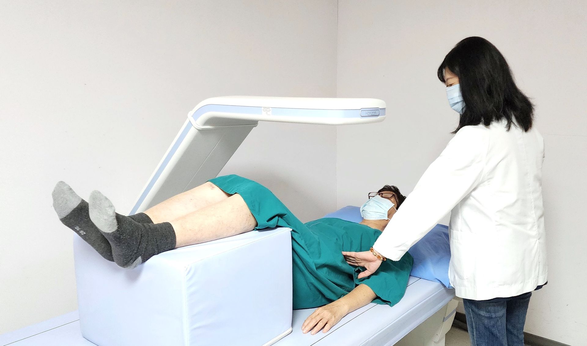 放射診斷科超音波乳房影像骨質密度組醫事放射師李文玉於雙能量X光吸收儀(DXA)檢查前,協助病人進行擺位示意圖(圖中為示意病人)