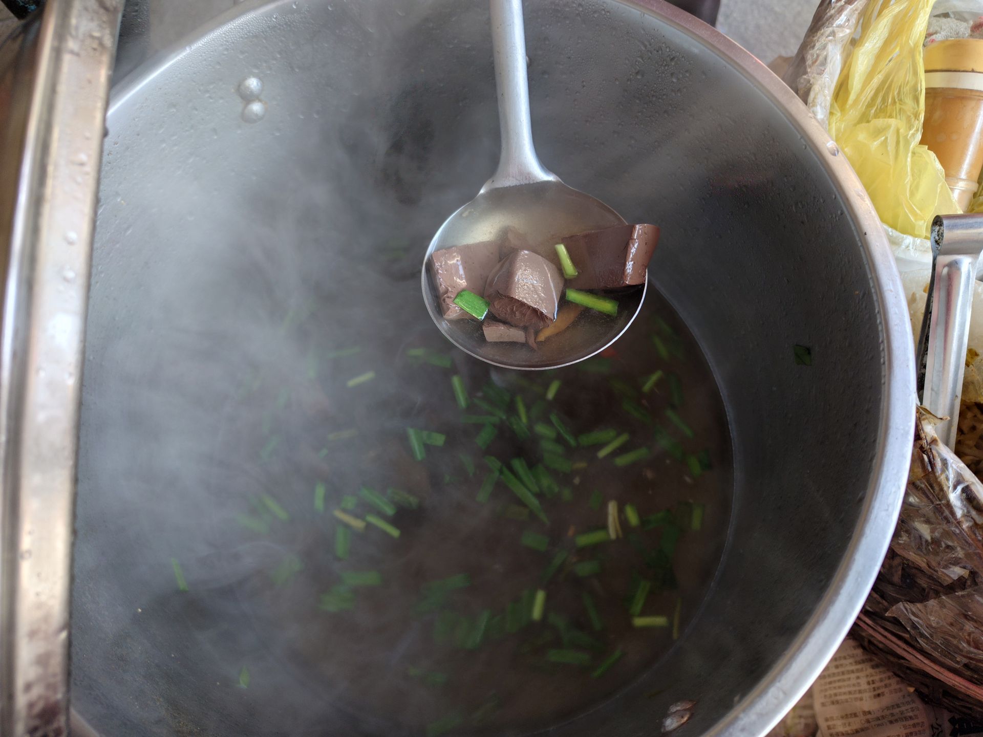 筆者嫁為人婦,當下營人三十五年,吃過店家的豬血湯,也自己煮過,可從來沒嚐過賣了一甲子的豬血湯,那天有個小聚會,剛好遇見豬血湯推車,沒嚐過的、想回味的,就這麼當場嚐鮮了。只要是下營人,住在市場附近街道的村民,男女老少幾乎都吃過,怎麼一向喜歡美食小吃的我會錯過?
