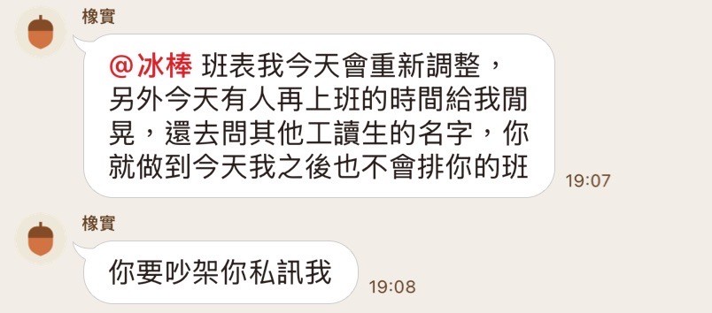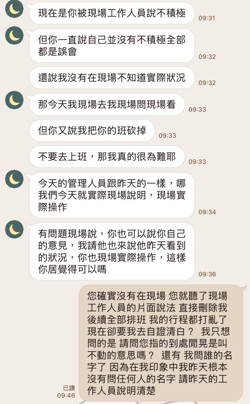 A先生事後私訊該名管理人員,隔日上午收到回覆,從對話紀錄可見對方坦承係聽信現場人員說法後做出調整。更令A先生不解的是,該管理人員在對話中又表示希望他「當日回去上班,給一個平反機會」。A先生質疑,在群組已公開指控並刪除班表後,再要求當事人回去「證明自己」,程序上顯有爭議,也對其名譽造成影響。