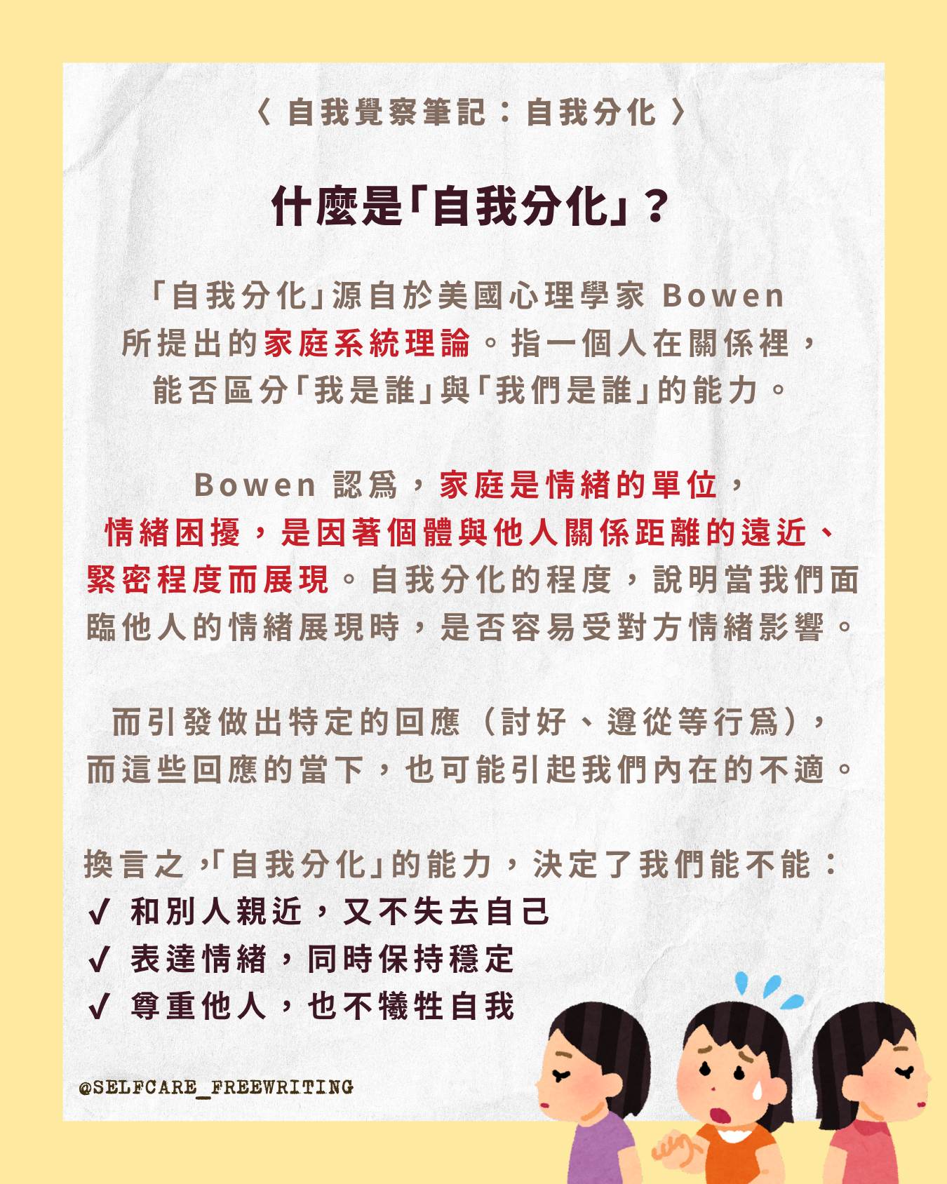 這是由心理學家包溫(Murray Bowen)提出的核心概念。所謂「自我分化」,是指一個人能在情感連結中保持理性與獨立的能力。分化程度高的人,可以愛家人、關心家人,卻不會被家人的情緒牽著走。