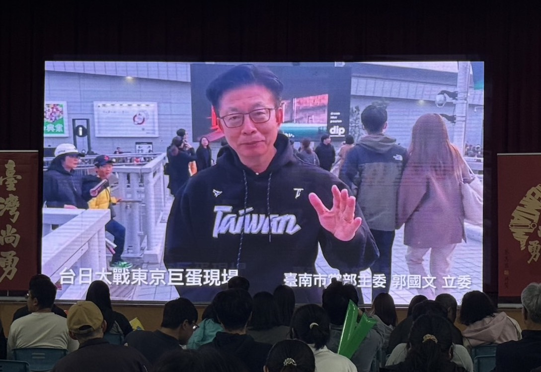市黨部主委郭國文立委說明,這次是第二次辦理直播派對,也是實現對小球員的承諾,上次在大遠百和很多青年朋友見證冠軍賽,這次是在公益包場時,與小球員相約看直播,一起看台日戰。基於黨部公益化理念,從戶外現場轉播台灣隊比賽,到包場看電影,乃至去年面臨風災、雨災、震災,如同大家所說,不能只在贏球的時候愛棒球,任何時候,都要愛棒球,愛台南。郭國文雖然人在東京巨蛋,藉由連線播放,向所有小球員表達敬意,也勉勵小球員平日辛苦練習,有機會投入國際棒球賽事,更感謝現場民眾到場應援。